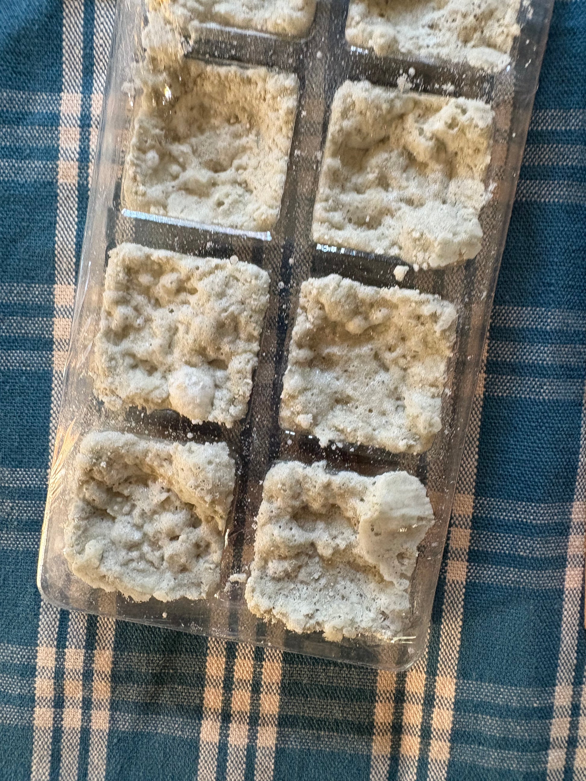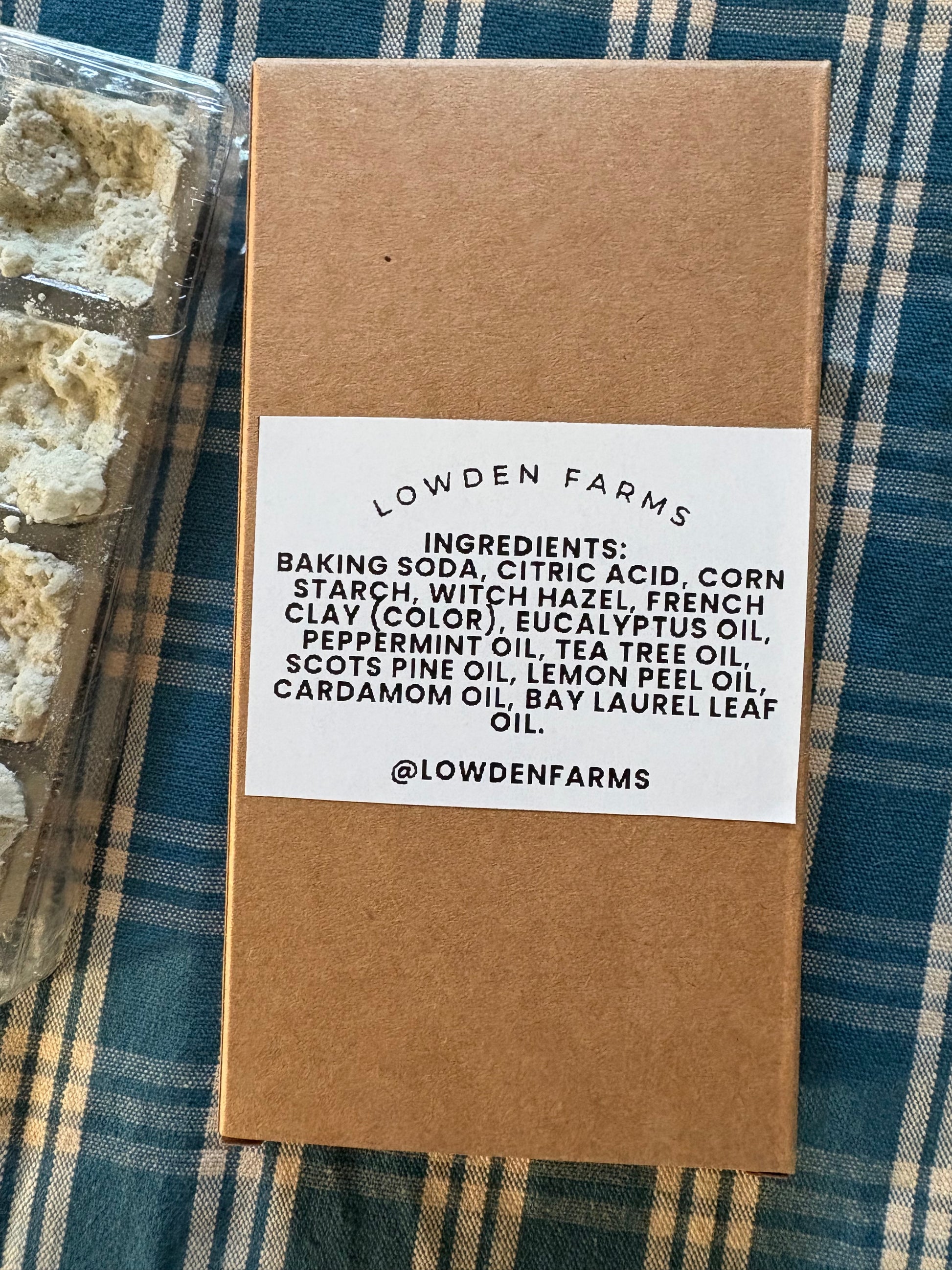 ingredients: baking soda, witch hazel, cornstarch, citric acid, peppermint essential oil, eucalyptus essential oil, bay leaf oil, lemon peel oil, tea tree oil, cardamom oil, and French clay for color