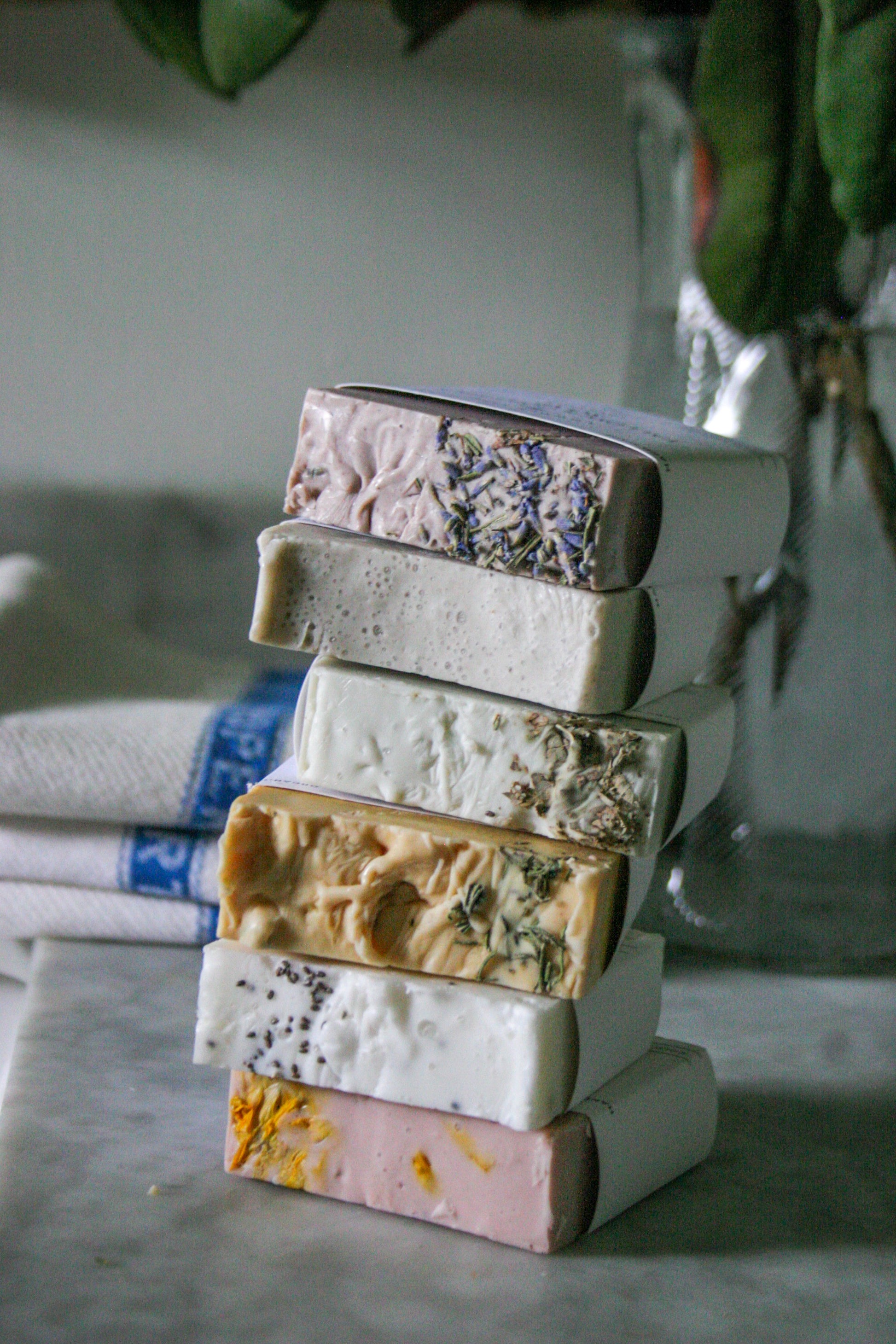 Organic grass-fed beef tallow, goat milk soap base, Cold pressed avocado oil, LAVENDER ESSENTIAL OIL, LAVENDER BUDS, ALKANET ROOT POWDER (COLOR)